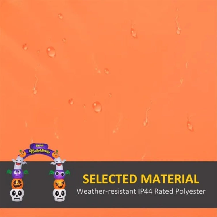 - - Inflatable Halloween archway with pumpkins, skulls and ghosts, bats and archway beams, and yellow lettering brings a cohesive Halloween display together