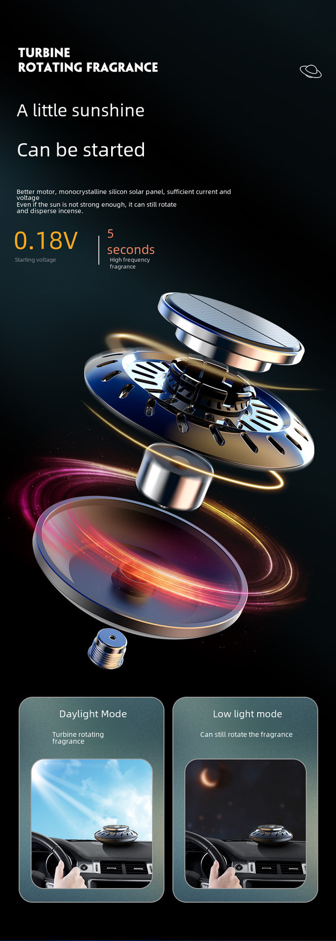 - Solar Powered Rotation:This car fragrance diffuser is powered by solar energy, making it eco-friendly and easy to use. The rotation feature ensures a continuous fresh scent in your car.